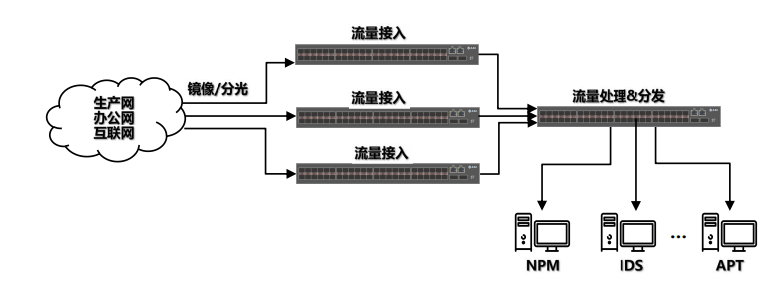 联诚合创汇聚分流解决方案是通过分流器设备的联合组网来实现的,网络数据包通过交换机端口镜像或使用无源分光器的方式旁路至流量接入分流器设备,然后统一汇总至流量处理&分发分流器设备进行统一处理后发送给后端的NPM、IDS、APT等流量可视化分析工具使用。
